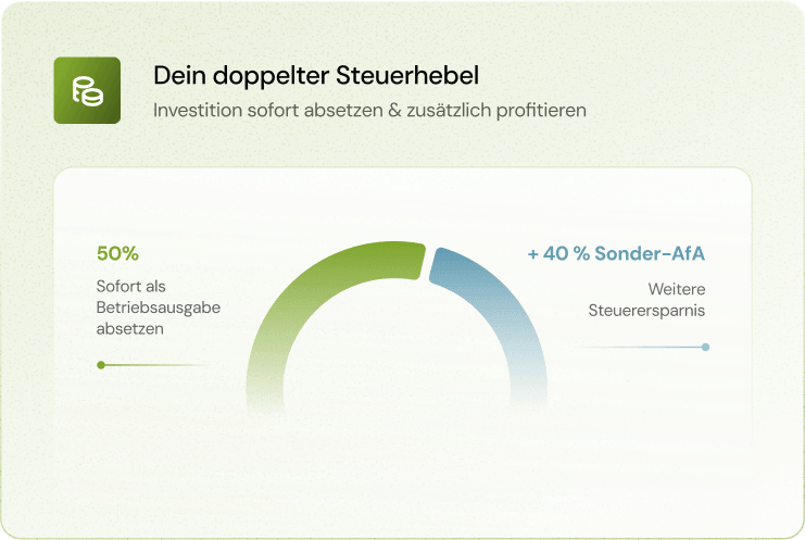 Setze bis zu 50 % deiner geplanten Investitionskosten sofort als Betriebsausgabe an und reduziere damit unmittelbar deine Steuerlast. Auf den Rest greift die 40 % Sonder-AfA – dein doppelter Steuerhebel.