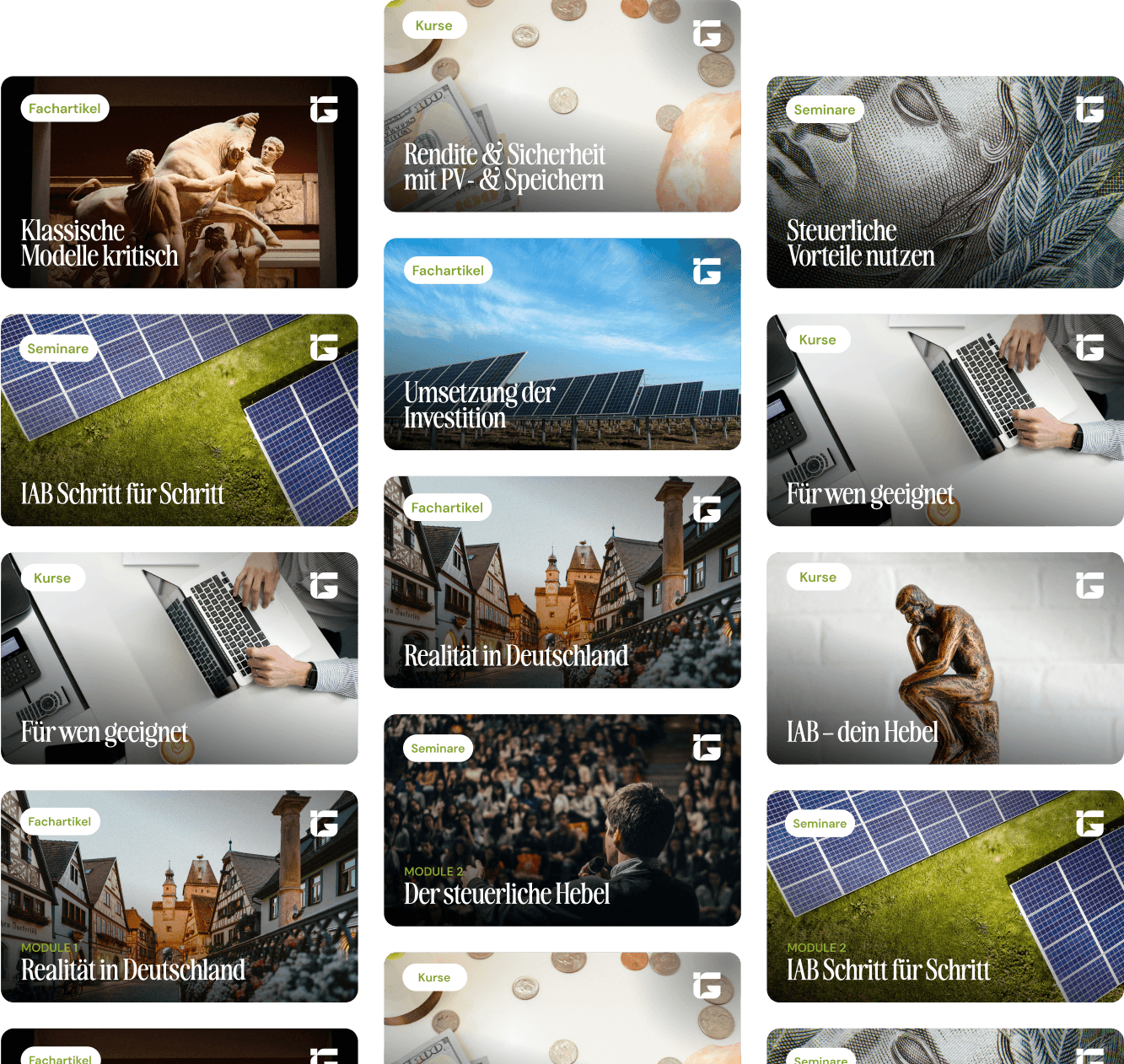 Egal, ob du gerade erst ins Thema einsteigst oder gezielt nach neuen Strategien suchst: Unsere Seminare, Kurse und Fachartikel geben dir transparentes Wissen, praxiserprobte Strategien und konkrete Einblicke in Photovoltaik- und Batteriespeicher-Investments. Verständlich erklärt, sofort umsetzbar – für alle, die mehr aus ihrer Steuerlast machen wollen.